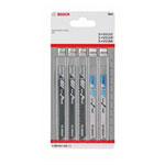 Bosch' jigsaw blade set, model 2608667855, includes five basic blades designed for cutting both wood and metal. These blades are equipped with a universal shaft, ensuring compatibility with most jigsaw models. Ideal for DIY projects and professional use, each blade in this set offers reliable performance and durability.