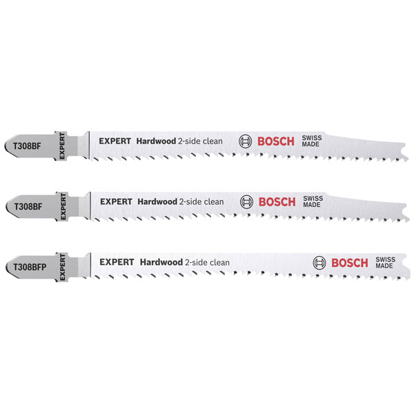 Bosch' Hardwood 2-side clean jigsaw blade set, model 2608900549, is designed for precise and clean cuts in hardwood. This set includes three pieces of T308BF/BFP blades, well-suited for intricate woodworking tasks. The blades ensure smooth performance, making them ideal for carpentry and detailed woodcraft projects.