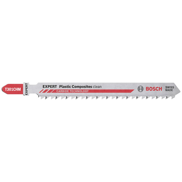 Bosch' EXPERT 'Plastic Composites Clean' T 301 CHM jigsaw blade is designed for efficient and clean cuts in plastic materials. This set includes three blades, each engineered for durability and precision. Typical applications include tasks such as model making, DIY projects, and cutting plastic piping or sheets.