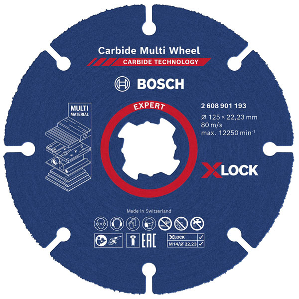 Bosch' EXPERT Carbide Multi Wheel X-LOCK is a cutting disc designed for efficient and precise cutting applications. This 125 mm straight cutting disc is durable and versatile, suitable for cutting a variety of materials including wood and metal. The product is ideal for professional use in construction or renovation tasks.