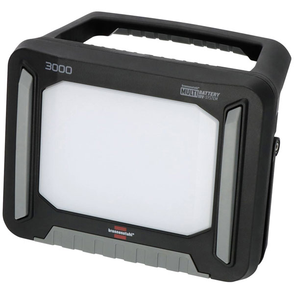 The extremely robust and luminous multi-battery LED battery spotlight with 30 W power is compatible with various 18V batteries (different Ah classes) from the seven power tool manufacturers Bosch Professional, Dewalt, Festool, Flex, Makita, thanks to the Brennenstuhl battery 18V system Metabo CAS, Milwaukee. No matter which battery system is already in use, the interface technology enables maximum flexibility and it enables access to the battery system of your choice. The appropriate adapter (all included) can only be used at the interface with one hand. LED industrial light with 3150 lm offers an optimal light distribution through large illumination for work light with reduced apertures. The impact-resistant industrial light is used for flexible and random use, whether standing, flat for wide-area illumination or for mounting on a stand. The impact-resistant work spotlight with enormous luminosity thanks to the in-built SMD LEDs also has a battery status indicator for the remaining power of the inserted battery (the batteries can be charged externally) and a protection system for power tool batteries. This protects the inserted batteries against deep discharge and overheating (caused by high load currents).