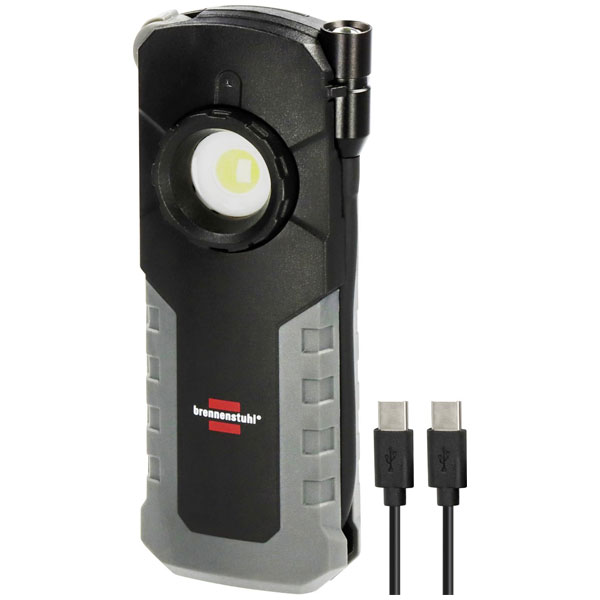 The Battery LED Hand Lamp HL 1000 ACW from Brennenstuhl is an extremely robust inspection lamp with replaceable Li-Ion rechargeable 3.7V/2.5Ah battery and a charging level indicator for illuminating confined and hard to reach environments. This versatile LED working light with protection class IP54 has four different switching stages (Spot - COB: 100%-50%-25%), in order to meet every requirement. The inspection lamp can be recharged via the USB C charging interface comfortably using the supplied USB C charging cable or alternatively via the separate wireless charging pad (not included in the delivery). The rubberized surface provides the best grip for the LED battery workshop lamp.