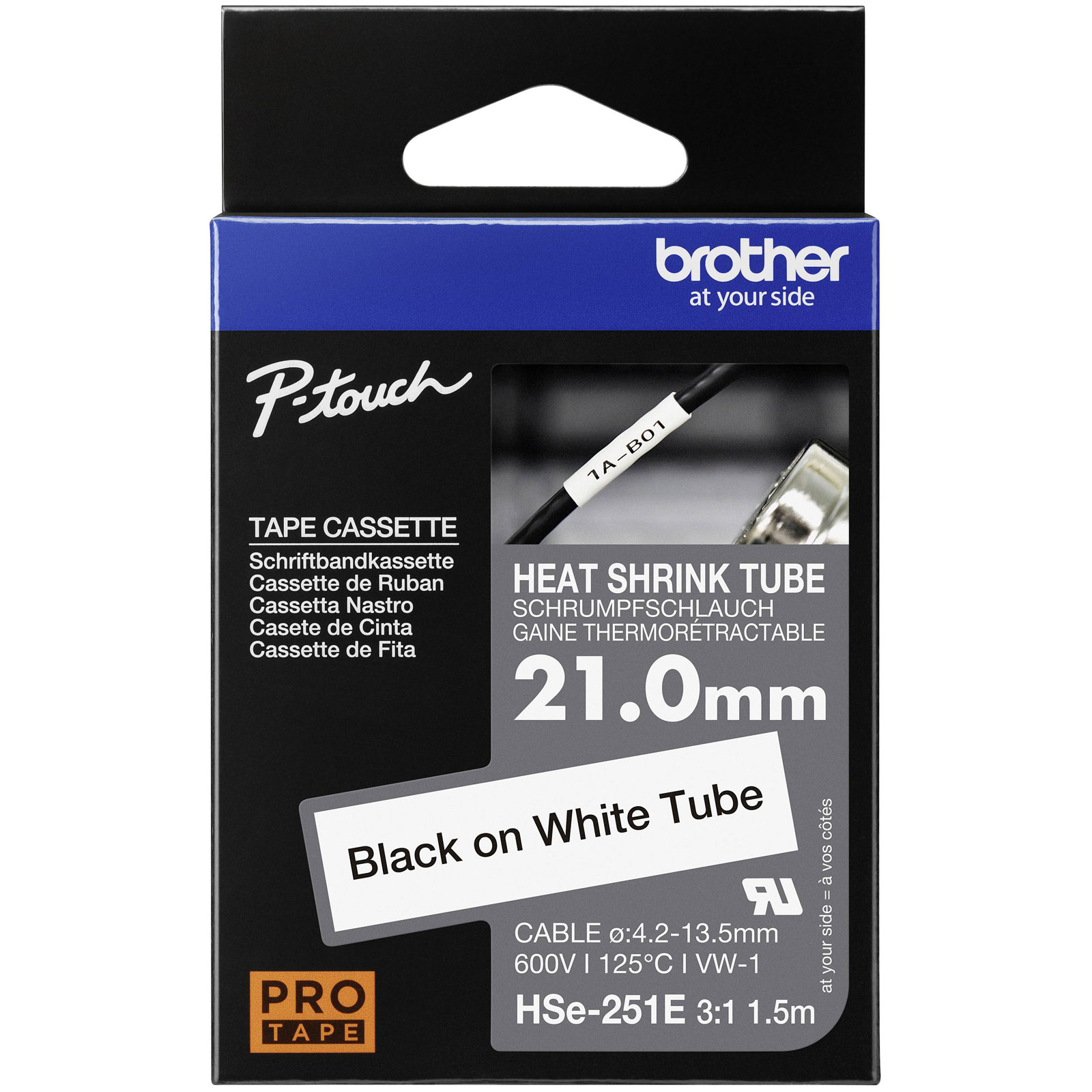 Brother HSE251E, offers a heat-shrinkable label tape designed to provide durable and reliable marking solutions, particularly for cable and wire identification. The tape measures 23.6 mm in width and extends to a length of 1.5 metres, delivering effective coverage and marking for various engineering applications. Engineered for use with compatible Brother label machines, this tape is ideal for creating heat-shrink labels that can withstand harsh environments, making it suitable for applications in telecommunications, electrical installations, and data centres where precise and permanent labelling is essential. The heat shrink technology ensures the labels snugly fit over cables, providing clear and resistant identification in demanding conditions.