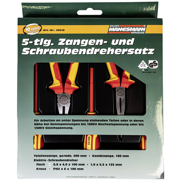 The Brüder Mannesmann M10610 VDE Pliers Set is a five-piece collection of precision hand tools. It features high-quality pliers and tweezers designed for safe electrical work. Ideal for both professional and home use, this set ensures safety and efficiency in various electrical and mechanical applications.