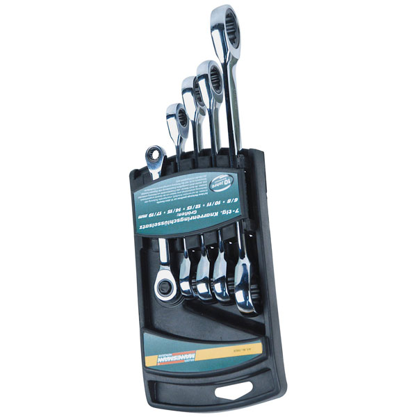 Brüder Mannesmann's M19828 is a 5-piece ratcheting box wrench set with spanner sizes ranging from 6 to 19 mm. This tool offers efficient and convenient fastening for various mechanical and automotive tasks. Ideal for both professional and DIY use, it delivers precision and ease in tight spaces.