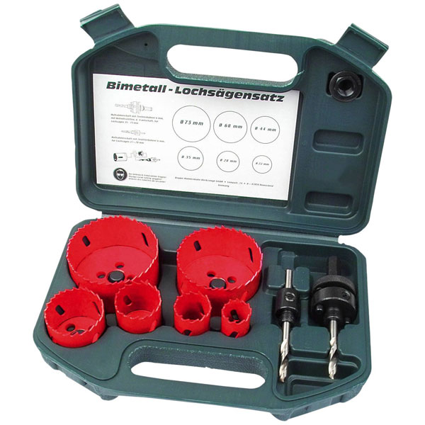 The Brüder Mannesmann M44100 Hole saw set is an 8-piece drill attachment kit. It is ideal for cutting precise holes in various materials such as wood and plastic. This set is suitable for both professional and DIY applications.