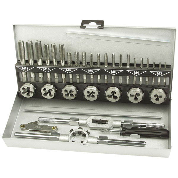 The Brüder Mannesmann M53250-B Tap Tool Kit is a comprehensive 32-piece set designed for cutting and repairing threads. Known for its precision and durability, this assorted tap and die set is ideal for both professional and DIY applications. The tools within the kit are perfect for threading tasks on various materials, ensuring versatility in use.
