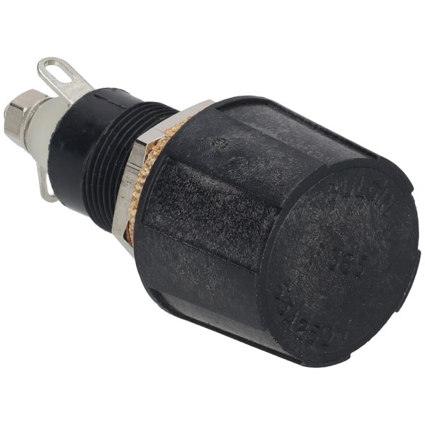 Bulgin FX0365 6.3A 5x20mm Panel Mount High Profile Fuse Holder - The FX0365 is a high profile Panel-mount Fuseholder with solder tag termination and screw cap/hand release fuse carrier. It has nylon insulating sleeve, silver-plated brass contacts, glass-filled nylon body, cap and spacer.