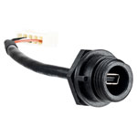 An ESKA Bulgin USB mini-B connector with cable attached. Mount the USB connector to the panel or enclosure and plug the other end into a suitable PCB connector for ease of assembly.