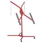 Adjustable padded arms and chains support bumpers during preparation and spraying. Main frame pivots and locks through 180°. Two castor wheels allow manoeuvrability between preparation area and spray booth.