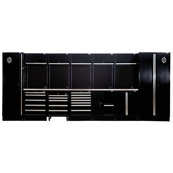 This Draper BUNKER® 04393 Modular 25pc Storage Combo with Stainless Steel Worktop contains a two door cabinet, a five and seven drawer cabinet, a five drawer mobile cabinet, two tall cabinets, five single door wall cabinets, and one multi-functional floor cabinet for maximised storage.