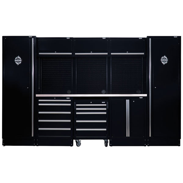 This Draper BUNKER® 04402 Modular 16pc Storage Combo with Stainless Steel Worktop contains a two door cabinet, a five drawer cabinet, a five drawer mobile cabinet, two tall single door cabinets, and three single door wall cabinets for maximised storage.