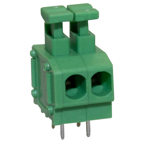 A 2 pole 3.81mm screwless terminal block designed for use on PCBs.