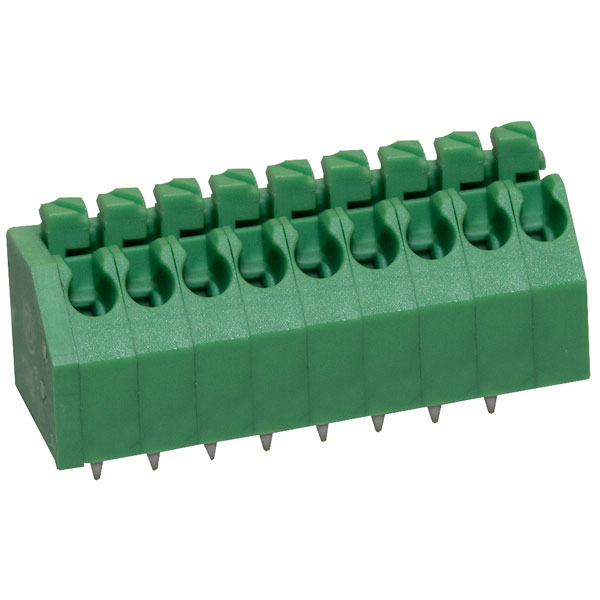 A 9-pole 3.5mm screwless terminal block with 45° cable entry and dual row offset pins. Designed for use on PCBs.