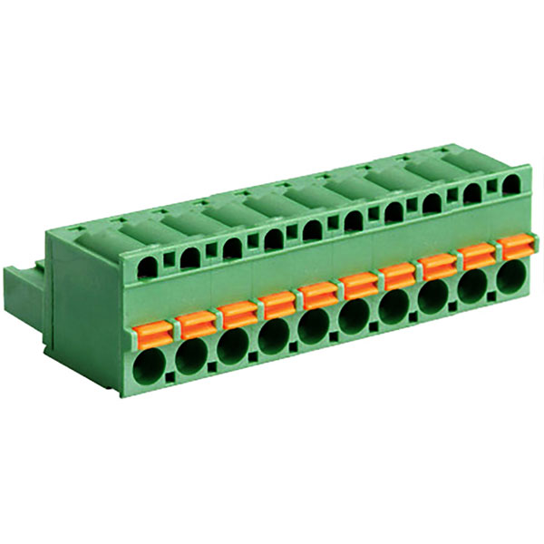 A 10-pole 5.08mm pitch pluggable screwless terminal block designed for use on PCBs.