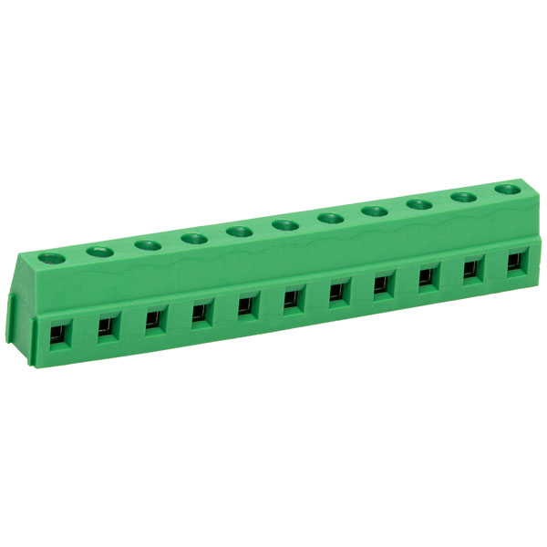 A 11 pole 7.5mm pitch professional rising clamp terminal block designed for use on PCBs.