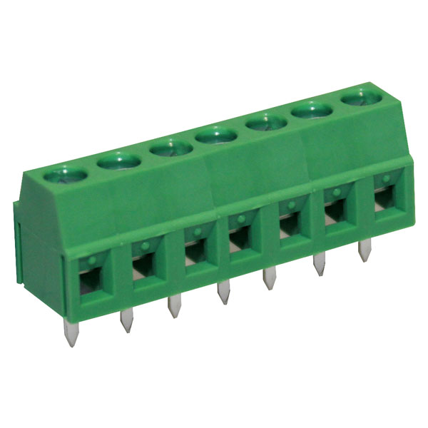 A 7 pole 3.81mm pitch professional vertical rising clamp terminal block designed for use on PCBs.