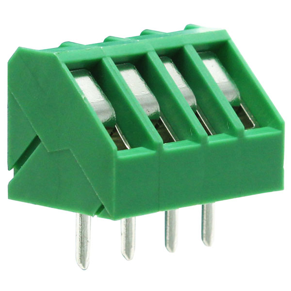 Low profile 45° rising clamp terminal block with 4 poles from the CamBlock Plus range by CamdenBoss. These green blocks are made from flame retardant polyamide.