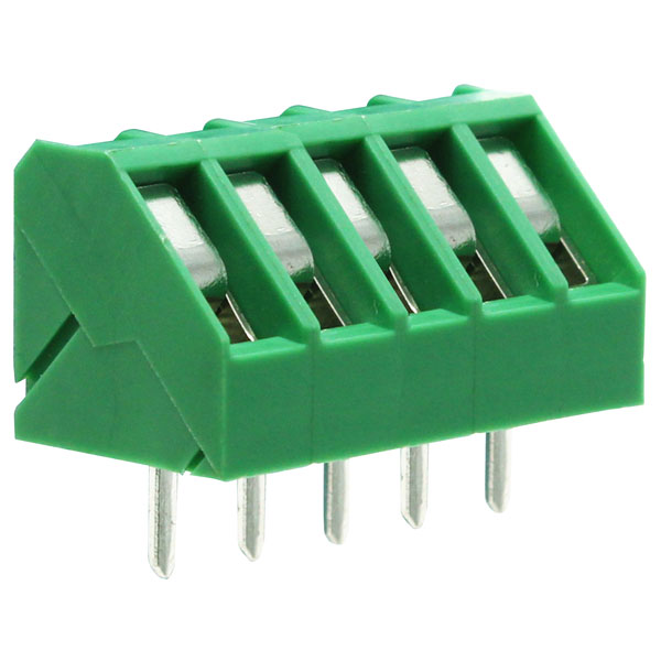 Low profile 45° rising clamp terminal block with 5 poles from the CamBlock Plus range by CamdenBoss. These green blocks are made from flame retardant polyamide.