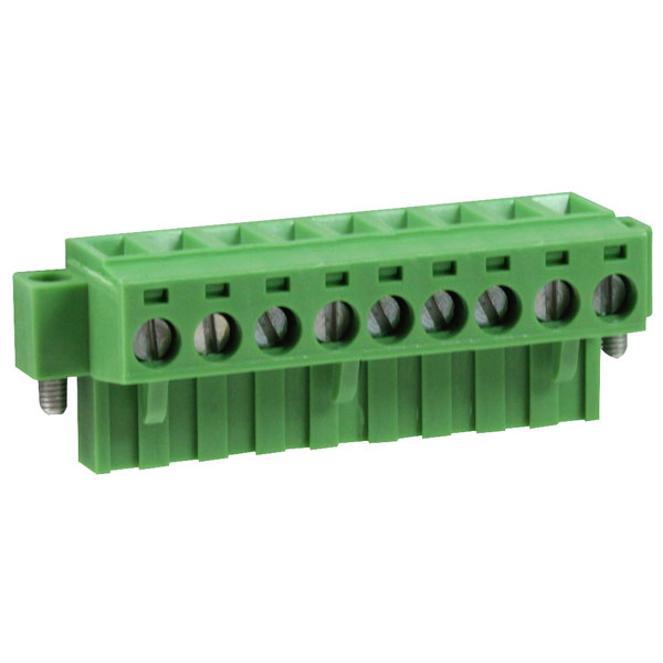 A 9 pole 5.08mm pitch, pluggable, professional rising clamp terminal block designed for use on PCBs.