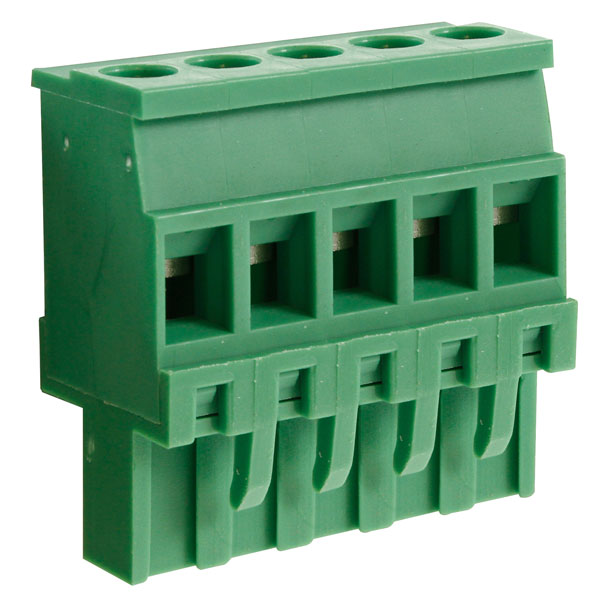 Pluggable 5-pole female vertical rising clamp terminal block from the CamBlock Plus range by CamdenBoss. These green blocks are made from flame retardant polyamide.