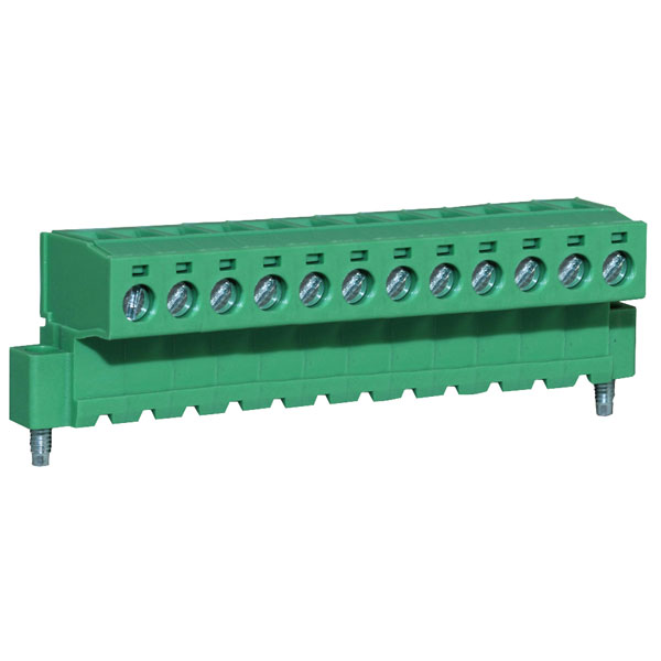 A 12-pole screw terminal to flanged, pluggable male 5.08mm pitch professional rising clamp terminal block designed for use on PCBs.