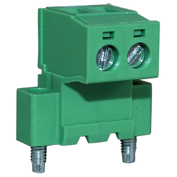 A 2-pole screw terminal to flanged, pluggable male 5.08mm pitch professional rising clamp terminal block designed for use on PCBs.