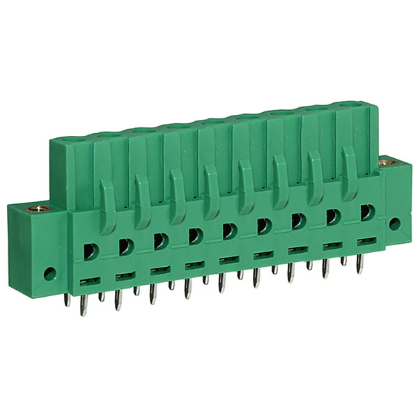 A 9 pole flanged pluggable female vertical 5.08mm pitch professional rising clamp terminal block designed for mounting on PCBs.