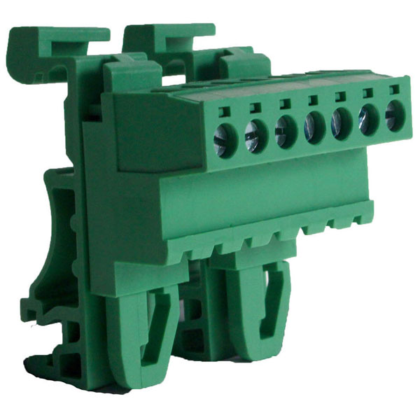 A 7 pole pluggable male horizontal 5.08mm pitch professional rising clamp terminal block designed for DIN rail mounting.