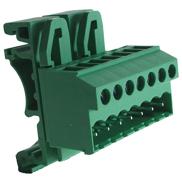 A 7 pole pluggable male vertical 5.08mm pitch professional rising clamp terminal block designed for DIN rail mounting.