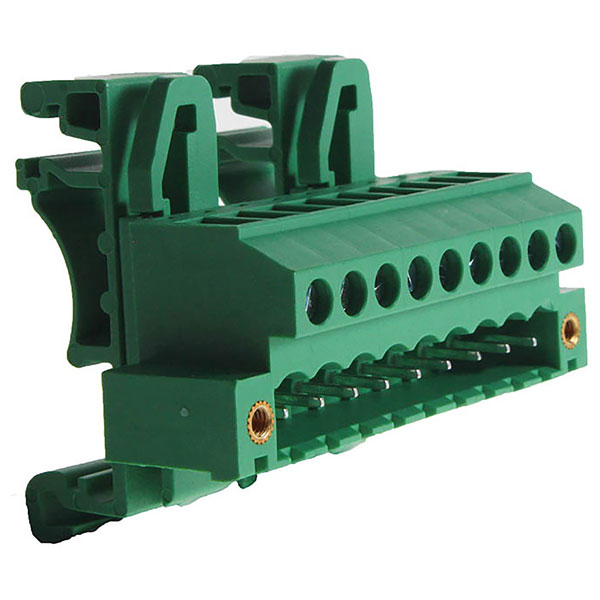 A 9 pole flanged pluggable male vertical 5.08mm pitch professional rising clamp terminal block designed for DIN rail mounting.