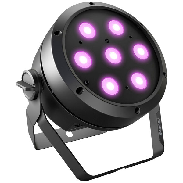 The Cameo CLROOTPAR4 LED PAR stage spotlight by Cameo features seven 4-watt LEDs, delivering powerful and efficient lighting. Its slim design makes it ideal for stage performances, concerts, and events requiring versatile par cans. This LED par spotlight is perfect for creating dynamic lighting effects and accents in professional stage settings.