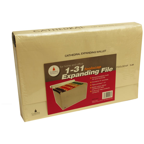 Cathedral Products EXPCA31 Manilla 1-31 Pocket Expanding File is the perfect way to organize paperwork. With 31 pockets, it's perfect for holding A4 and Foolscap contents. The heavy duty manilla construction is durable, and the front flap protects documents from dust and dirt.