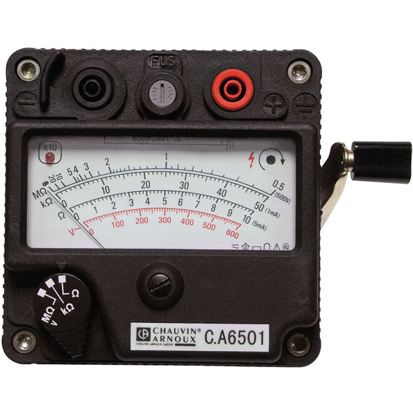 The Chauvin Arnoux CA 6501 insulation tester is intended for the measurement of low resistance values (up to 100Ω), of resistances (up to 500kΩ) and for insulation measurements (up to 200MΩ). The ohmmeter function is protected against the accidental presence of a voltage by a high breaking capacity fuse. There is also voltage-present indicator that serves to make sure that there is no AC voltage in the circuit to be tested. This instrument is ready for use at all times because it requires no operating maintenance. A hand cranked magneto generator provides the various measurement and operating voltages. Supplied with red and black 1.5m black angled / straight cords, red and black alligator clips, black probe tip, user guide in 5 languages and carrying bag.