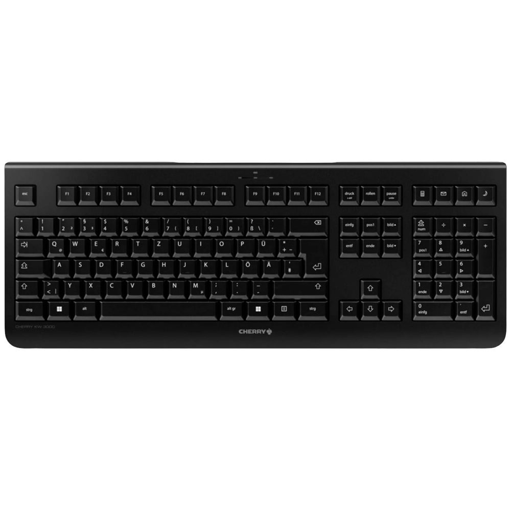 CHERRY JK-3000DE-2 is a high-performance wireless keyboard designed primarily for professional environments where quiet operation is essential. This device, known as the KW 3000, features a robust QWERTZ layout and includes a numeric keypad, making it ideal for data entry tasks and engineering applications where precision and efficiency are required. Its sleek black design complements modern office settings, while the quiet keys provide a comfortable typing experience without causing disruption in shared spaces. This keyboard is suited for use in offices, research facilities, and other professional environments that demand reliable and silent operation.