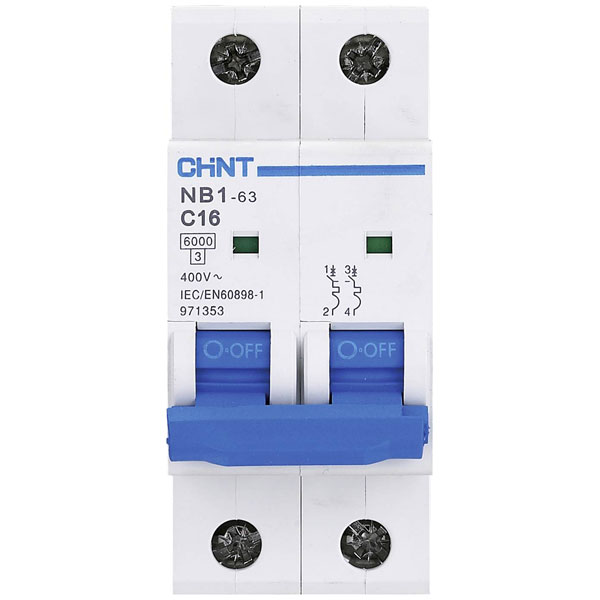 Chint's NB1L Circuit breaker is a two-pin device rated for 16 A. It is designed to protect electrical circuits by disconnecting power during overloads or short circuits. Typically used in residential and commercial settings, it ensures safe and reliable electrical system operation.