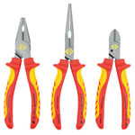 • - New Improved Handle Design, 30 % more material - Rounded design for less fatigue and longer handles for greater leverage - Two component, ergonomic design, with anti-slip horns for increased comfort, control and safety - Lanyard ready REDLINE VDE Handles, integrated design conforms to VDE - For construction, renewables and industrial - Secure working at height to ANSI standard - VDE approved - Individually tested to 10,000 V for safe live working up to 1,000 V - Induction hardened jaws for outstanding long term performance - Cutting jaws with C.K optimised geometry - Drop forged special alloy steel - Contents: Each 1 piece Combination Pliers T39072A 180, Snipe Nose Pliers T39076A 200 and CombiCutter 1 T39081A 160