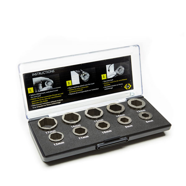 This patented nut and bolt extraction set, can be inserted into ring spanners and sockets to remove fasteners with damaged or worn corners.