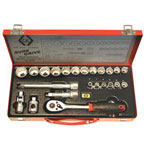 Set contains: Sockets 6, 7, 8, 9, 10, 11, 12, 13, 14, 15, 16, 17, 18, 19, 20, 21, 22 and 24mm; 75mm extension; 150mm extension/driver; universal joint; T-bar; reversible 45 tooth quick release ratchet.