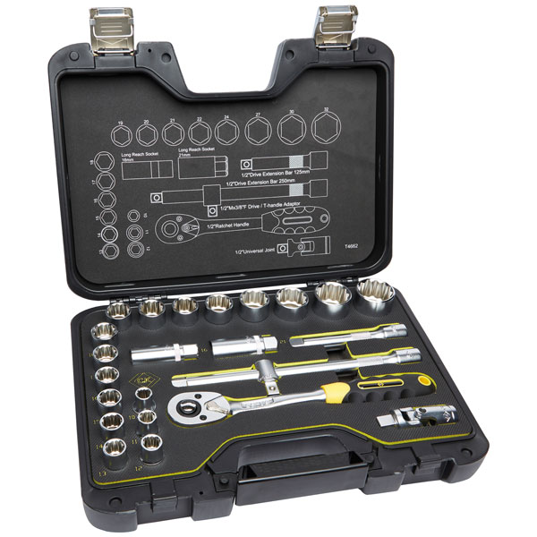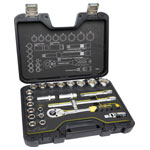 Heavy duty rust resistant, chrome vanadium construction 24 piece 1/2" socket and bit set, with reversible 72-teeth ratchet mechanism, for fine adjustment in confined spaces.