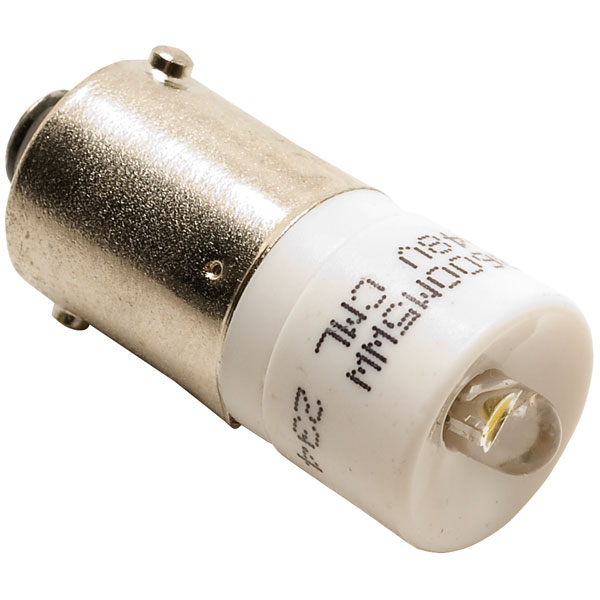 A 10mm diameter warm white LED indicator with a clear lens that has a BA9s type base fitting and can be powered by either AC or DC voltage. A wide input voltage range of 8 to 48V means that this LED is suitable for a wide range of applications and also obviates the need for keeping different voltage lamps as spares.