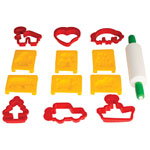 This assorted pack of plastic cutters and roller are ideal for use with soft playing dough and modelling material.