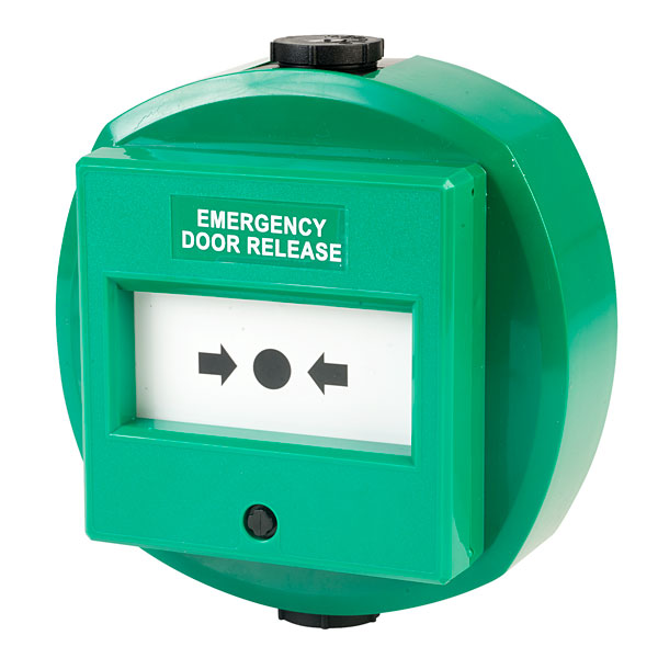 This surface mounting green emergency door release point has a waterproof housing and a glass-like resettable plate insert.