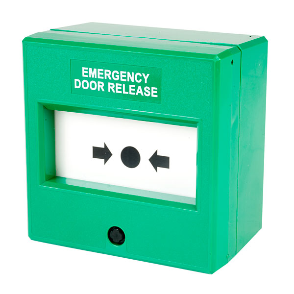 A surface mounting green emergency door release point with a glass-like resettable insert.
