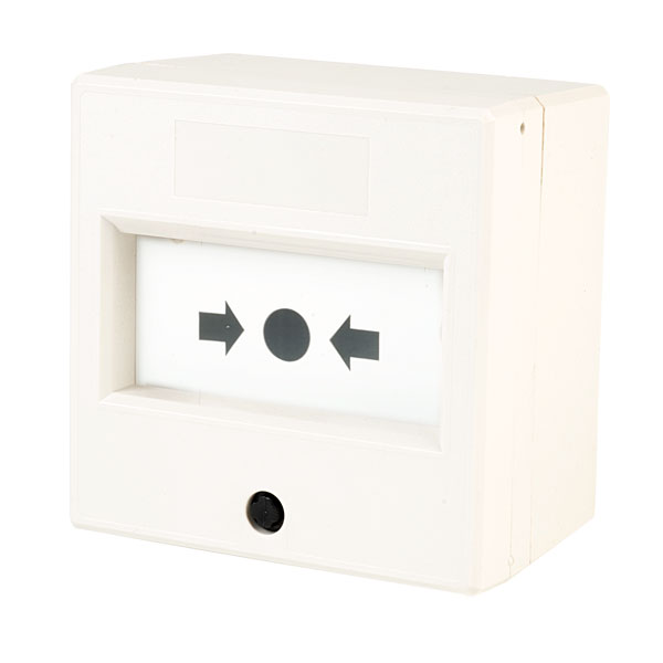 A surface mounting white emergency door release point with a glass-like resettable break plate insert. Supplied with various labels, e.g. "Gas Abort", "Gas Release", "EDR".