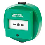 This waterproof surface mounting green emergency door release point has a glass-like break plate insert. The break plate is etched to assist activation.