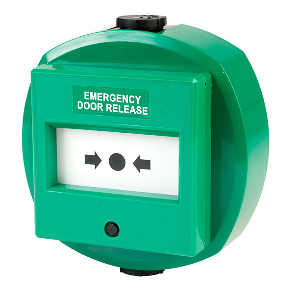 A green waterproof surface mounting emergency door release point with resettable break plate insert.