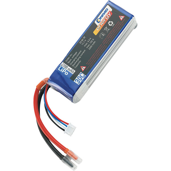 The Conrad Energy LiPoBattery 11.1V/2200mAh (30C)/XH is from the new Conrad Energy Lipo Series. With a 30C maximum safe continuous discharge rate and XH balancer plug-in system, these Li-Polymer batteries are perfectly suited for drives with normal to high power consumption.
