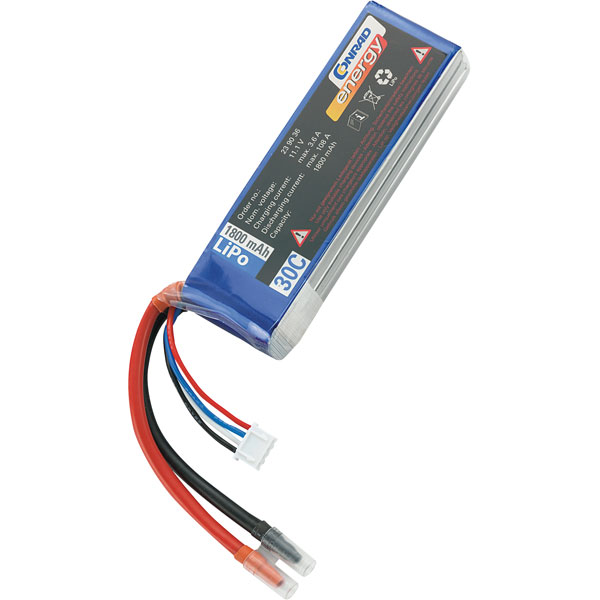 The Conrad Energy LiPoBattery 11.1V/1800mAh (30C)/XH is from the new Conrad-energy Lipo Series. With a 30C maximum safe continuous discharge rate and XH balancer plug-in system, these Li-Polymer batteries are perfectly suited for drives with normal to high power consumption.
