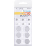 This collection of 18 button cell batteries includes the most popular sizes for clocks, games, calculators, radios, cameras, remote controls and more.